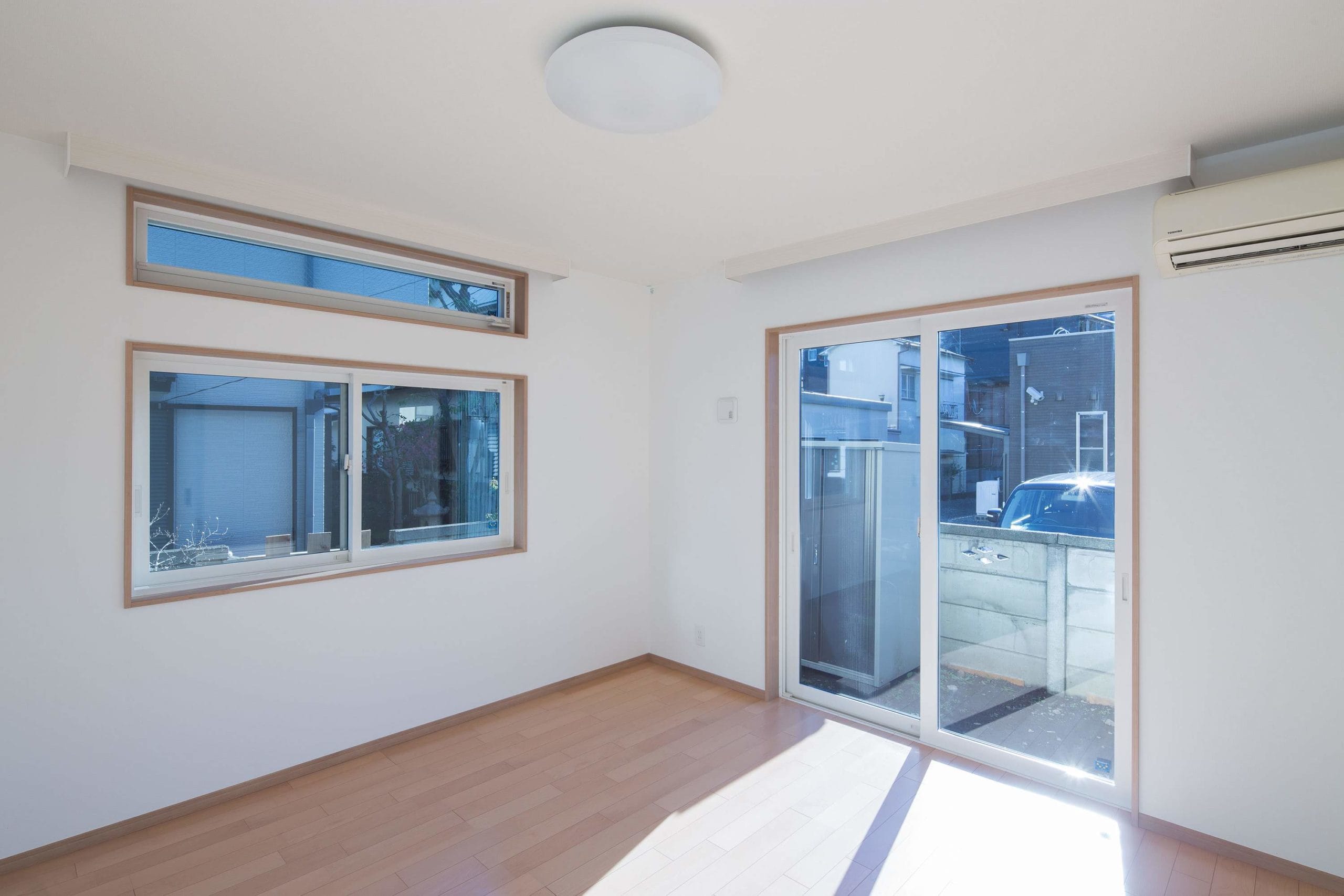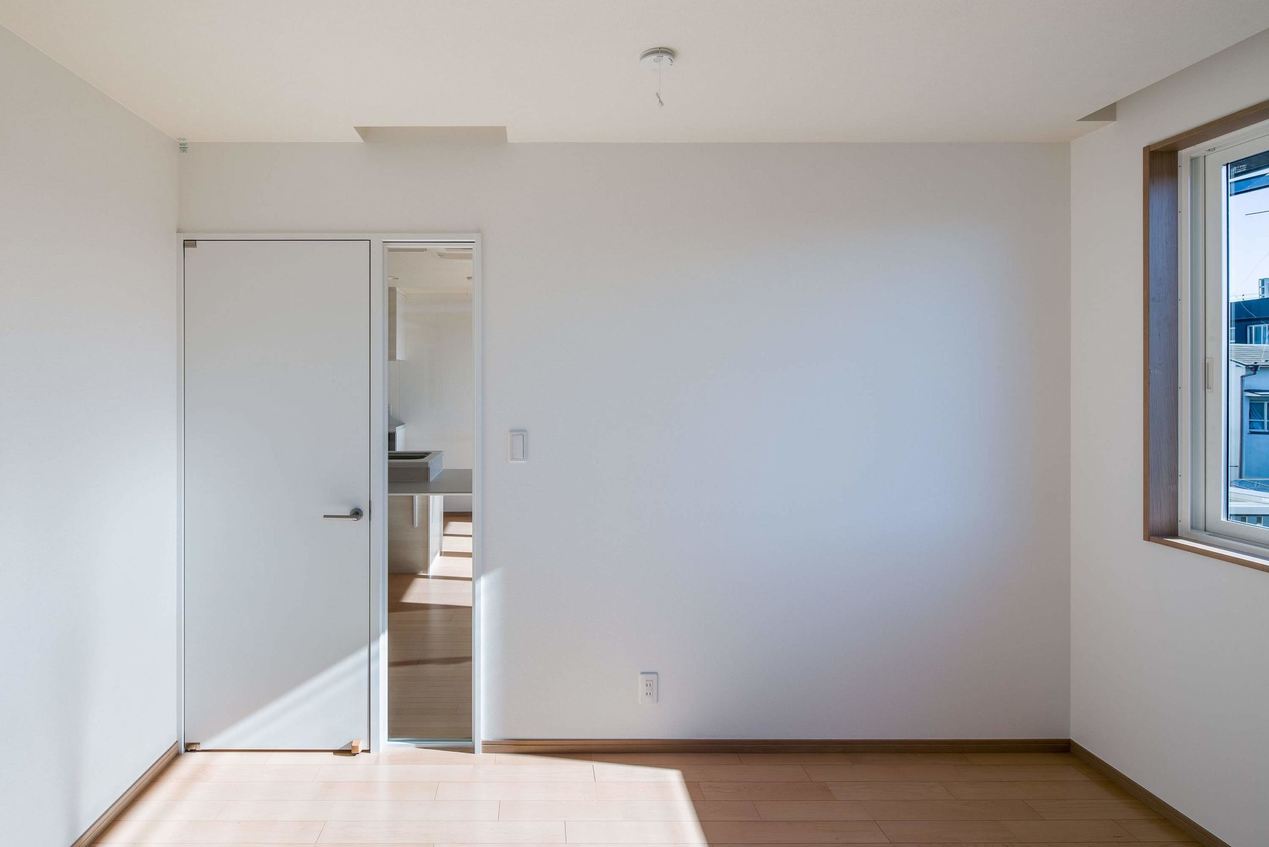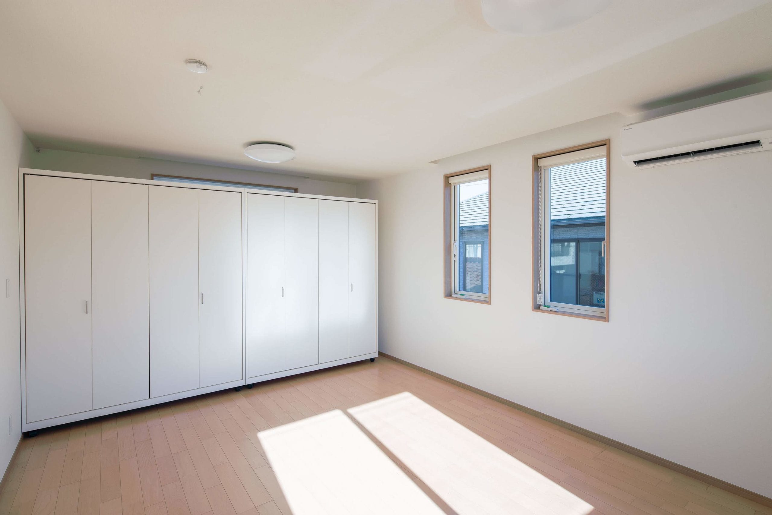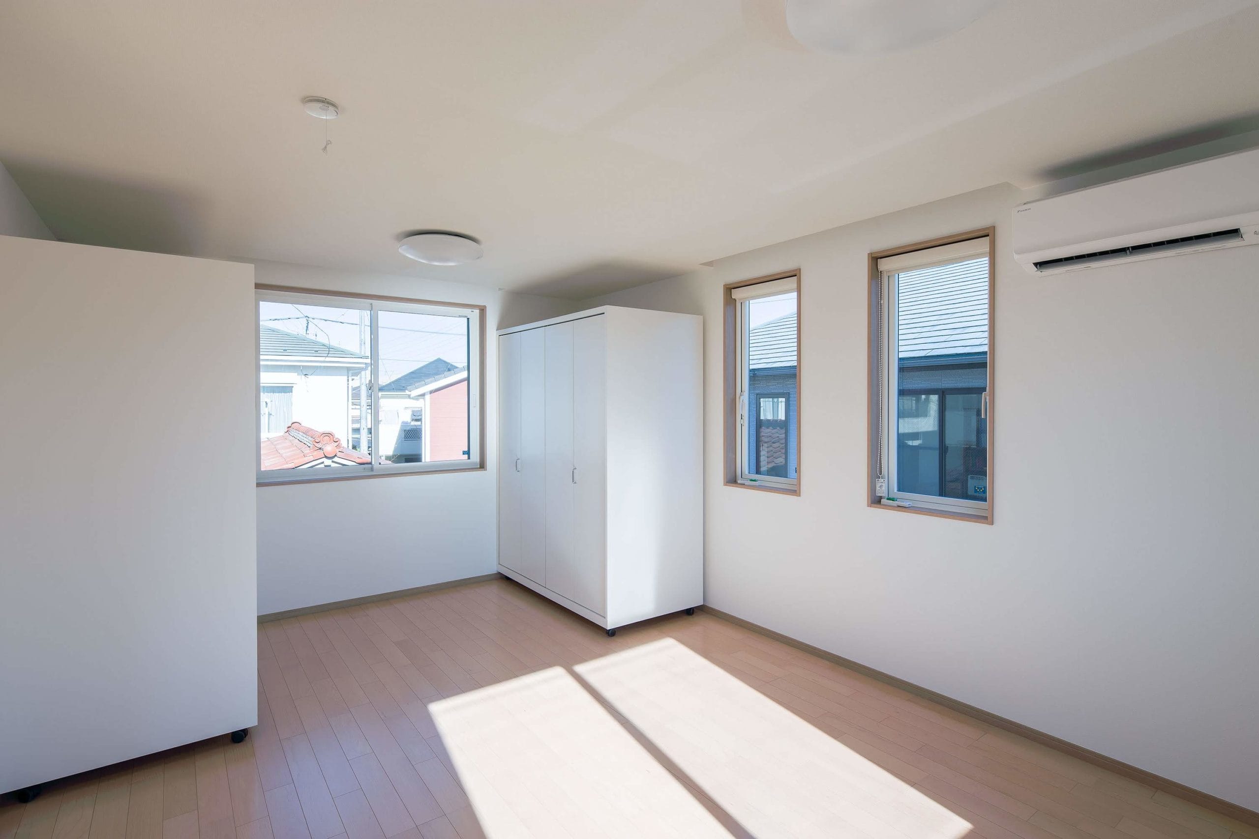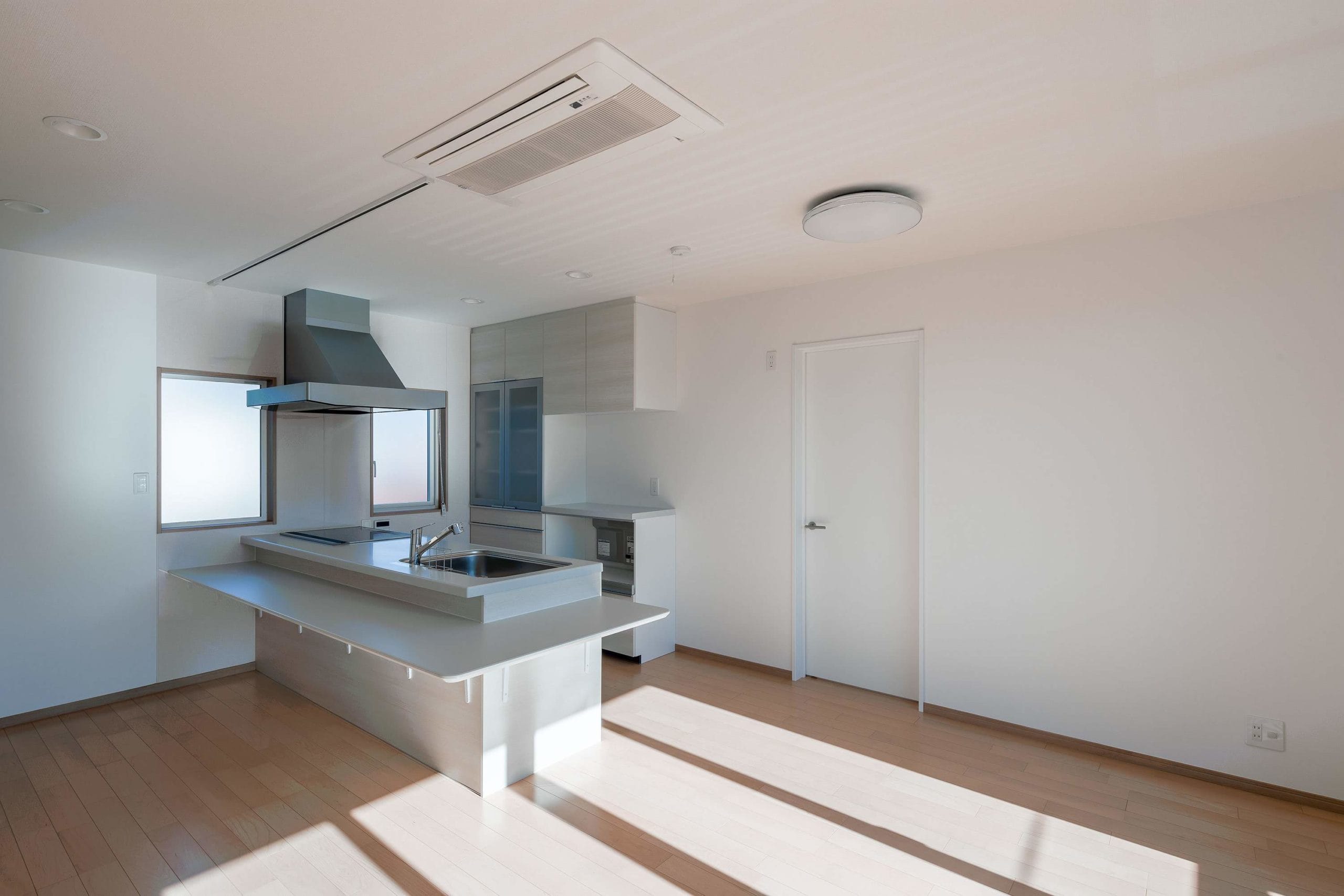 お施主様と息子様ご家族の2階建て二世帯住宅。各階で世帯ごとに生活が送れる構成。息子様世帯のキッチンはオープンなものとし、リビングと一体で利用できるものとした。リビングに併設する個室は、まだ小さい子供のお世話がしやすいよう開き戸の横にはめ殺し窓を設置。子供部屋は大型の可動家具で間仕切り、レイアウトを自由に変更できるものとした。