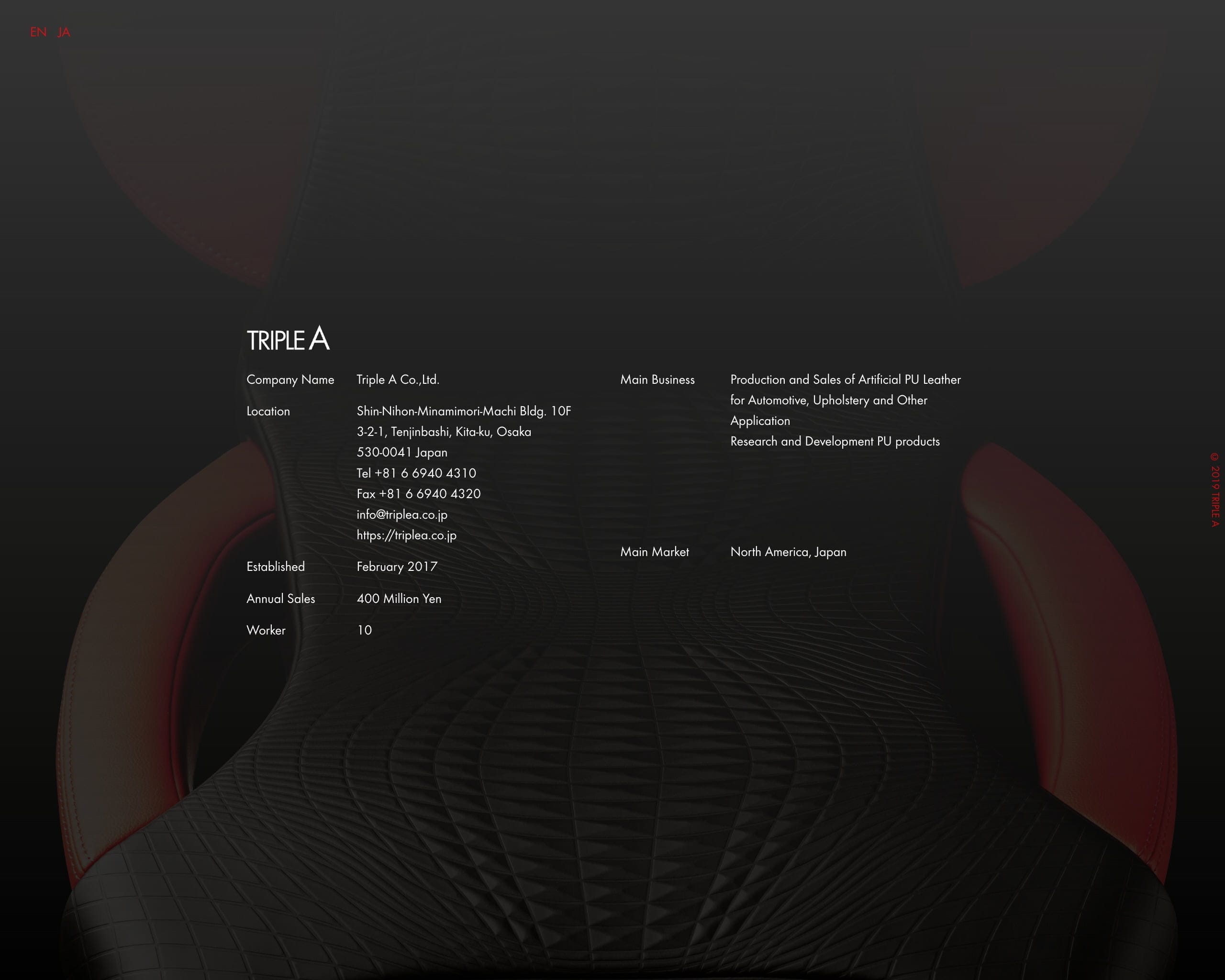 国内外問わず多くの自動車等に利用されている合成皮革を製造販売されているトリプルエー株式会社のウェブサイト。